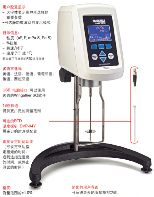 快速粘度測量的連續(xù)感應性能使經(jīng)濟型DV1數(shù)顯粘度計變得出眾不凡。同時測量粘度和溫度(采用可選溫度探針),18檔不同轉(zhuǎn)速可選。其具有定時測量功能,數(shù)據(jù)可輕松傳入電腦或打印機。DV1有多種語言可選,例如英語、法語、德語、葡萄牙語、俄語、西班牙語??蛇x軟件可使DV1采集、分析和記錄測試數(shù)據(jù)。
