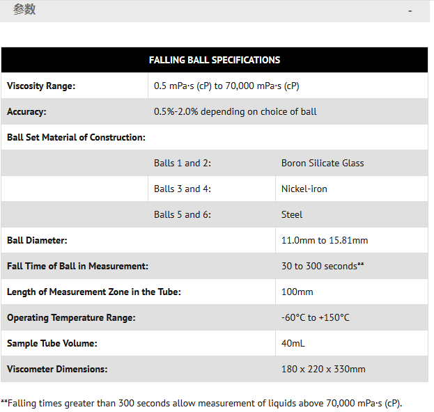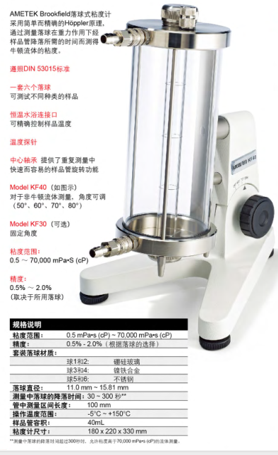 通過測量落球在重力作用下經(jīng)裝滿樣品且有傾斜角度的樣品管降落所需的時間而測得牛頓流體的粘度。三次測試的平均時間;用簡單公式將結(jié)果轉(zhuǎn)換為粘度值。